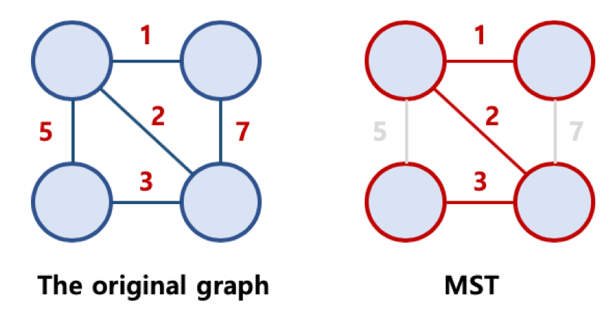 신장트리 (그래프 내부의 모든 노드가 연결되어 있으며 사이클이 없는 그래프) 중에서 간선의 가중치 합이 가장 작은 경로로 이루어진 트리