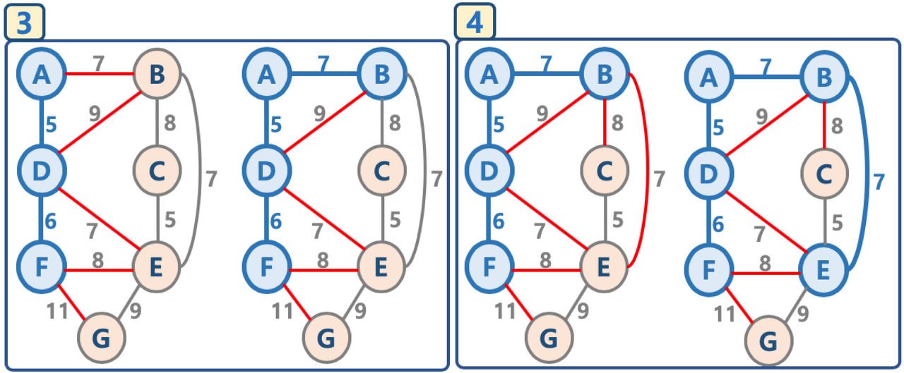 대표적인 최소 신장 트리 알고리즘으로, 탐욕 알고리즘을 기반하여 선택과 결정을 수행