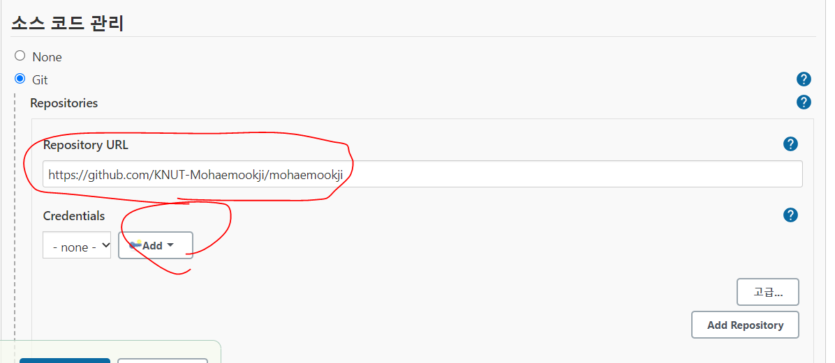 5. 아래 소스코드 관리 부분에서 레포지터리 주소와 Credentials 추가