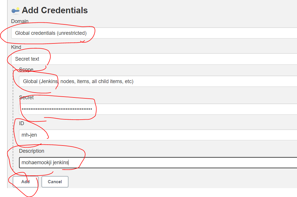 10. 사진과 같이 필요한 사항을 기입. Secret에는 깃허브 토큰키를 입력