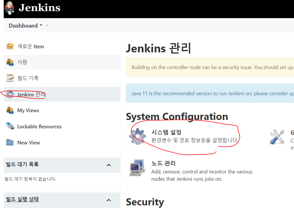 7. 젠킨스에 접속하여 관리 > 시스템 설정 접속