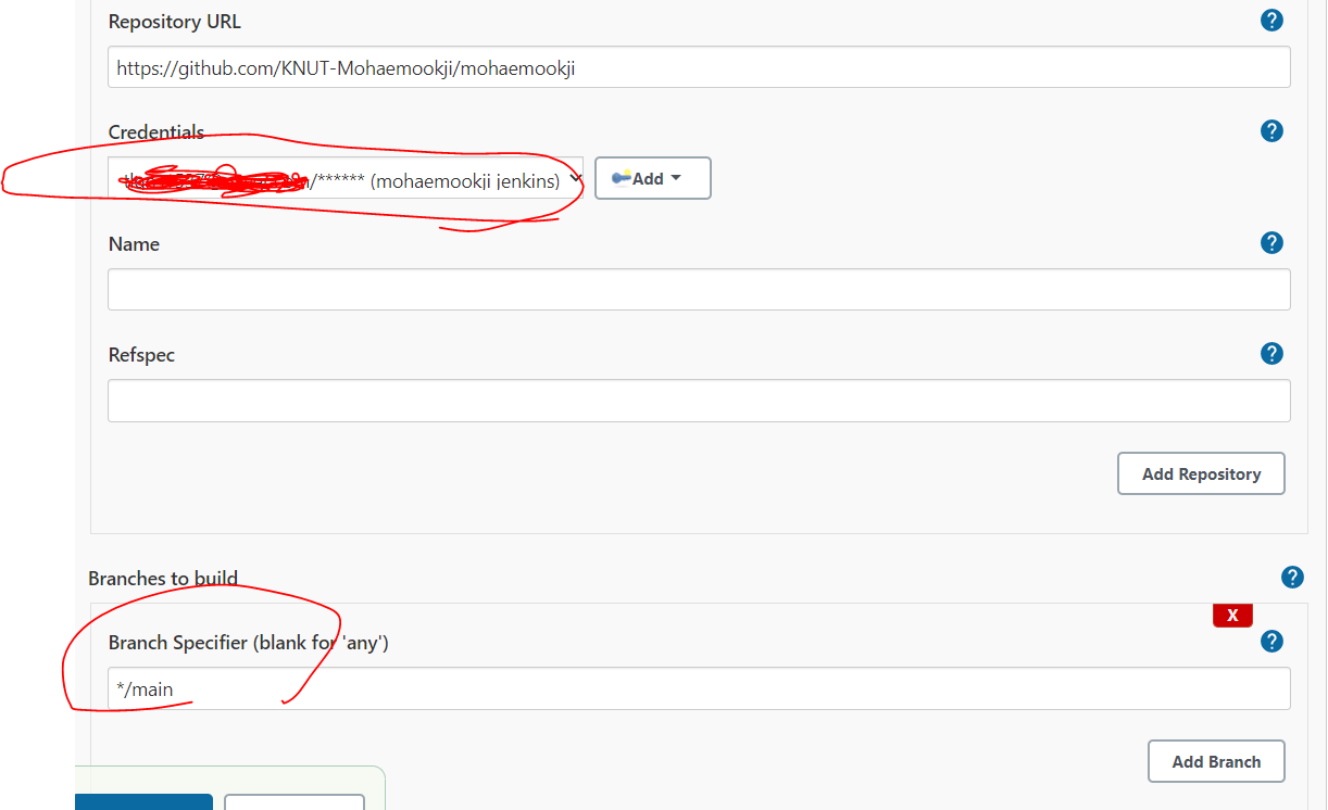 7. Credentials에 방금 만든걸 추가 / 빌드할 브랜치 입력