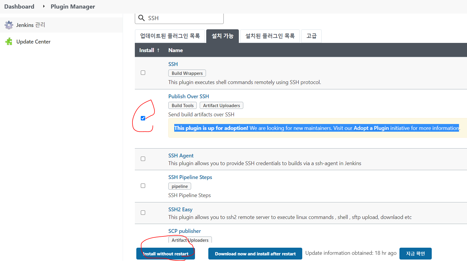 1. 젠킨스 대시보드 (http://젠킨스서버IP:포트번호) > Jenkins 관리 > 플러그인 관리