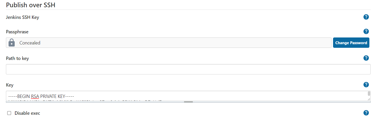 6. Jenkins 관리 > 시스템 설정 > Publish over SSH의 Key 부분에 복사한 키 붙혀넣기