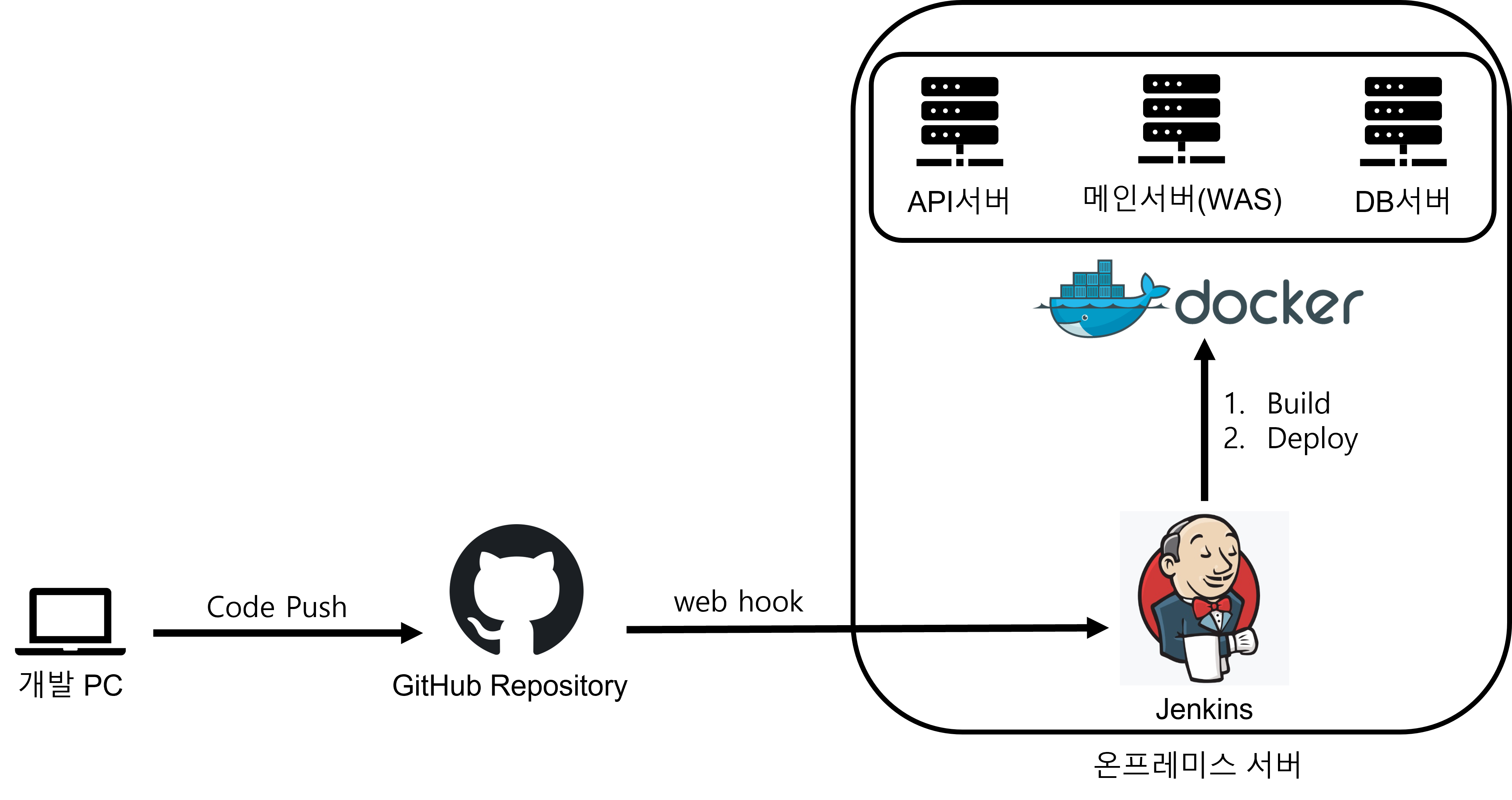 : 이 프로젝트의 구성은 개발용 PC와 깃허브, 서버용 PC로 이루어져있고 서버용 PC에 컨테이너를 통해 서비스를 제공하는 방식이었다. 일단 CI/CD 파이프라인을 설계하기 위해서 다른 사람들의 파이프라인을 참조 했었는데 젠킨스를 어떤 PC에 설치를 해야하는지 도무지 감이 잡히지 않았었다. 위에 내가 작성한 파이프라인 초안처럼 젠킨스가 중간에 있고 배포 서버에 빌드 결과물을 전송하는 그림이여서 깃허브 처럼 젠킨스가 따로 클라우드 형식으로 제공되는 서비스인줄 알았다. 그래서 일단 대략적으로 파이프라인을 그려보고 flow를 짠 다음 구글링을 통해 젠킨스 환경을 빌드하는 것과 젠킨스의 기능에 대한 내용 등등을 공부해보았다.