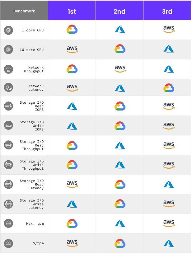 아마존웹서비스, 마이크로소프트 애저, 구글클라우드플랫폼, 3개 퍼블릭클라우드 서비스의 12가지 성능 기준 비교 결과 표. [자료=코크로치랩스 보고서]세계 클라우드 시장 점유율 1위...