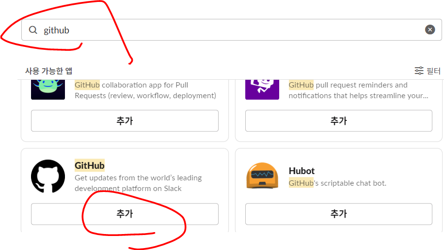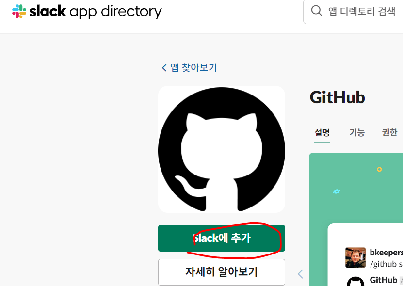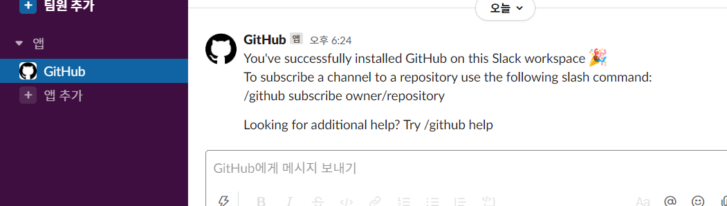 1. slack -> 앱 -> github 검색 -> 추가