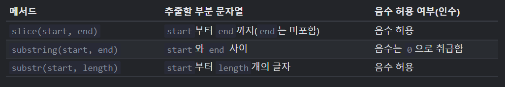 alert( str.slice(0, 5) ); // 'strin', 0번째부터 5번째 위치까지(5번째 위치의 글자는 포함하지 않음)
