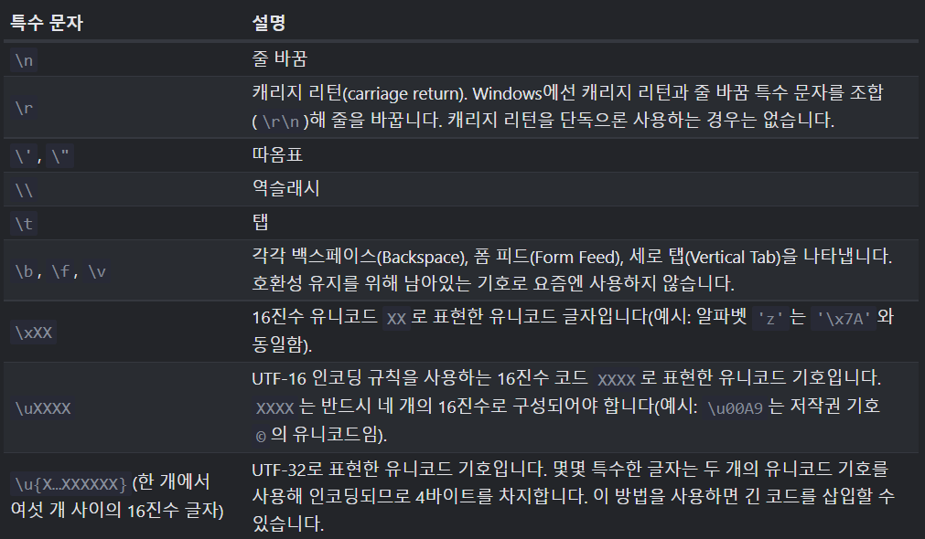 : 문자열 내에 따옴표를 넣는 등의 이스케이프가 필요할 때 \를 문자 앞에 사용