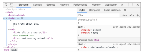 마우스로 웹 페이지 상의 노드를 클릭하면 Elements 패널에서 해당 노드를 표시