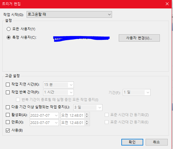 트리거탭 > 새로만들기 > 작업 시작 (로그온 할때) > 특정 사용자 (주 사용 계정 선택)