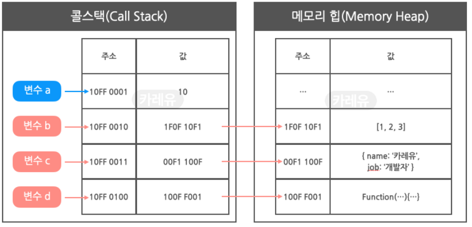 : 함수 호출과 관계되는 지역변수와 매개변수가 저장됨 (원시값)