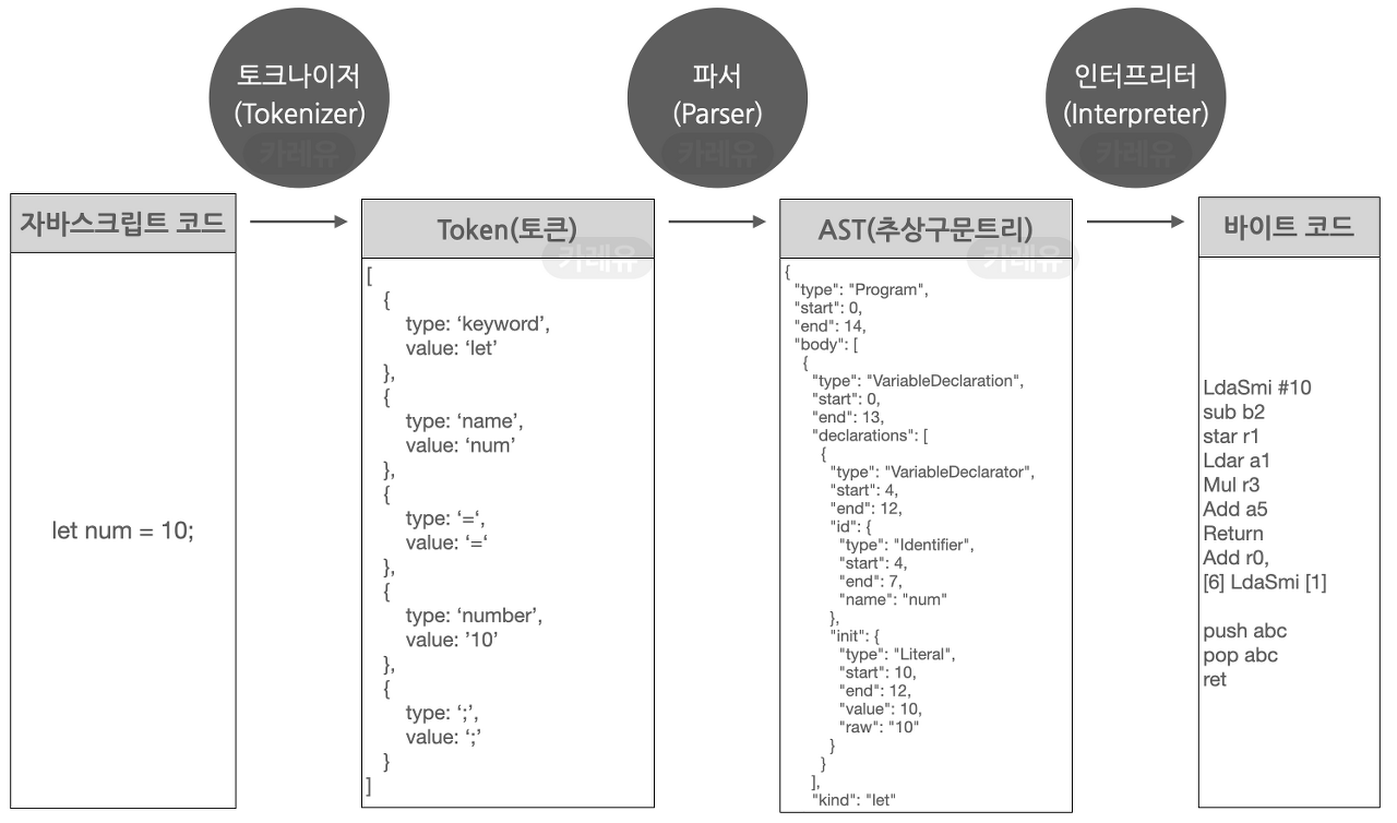 : 자바스크립트 코드를 마이크로 프로세서가 이해할 수 있는 기계어로 변환하는 프로그램 혹은 인터프리터