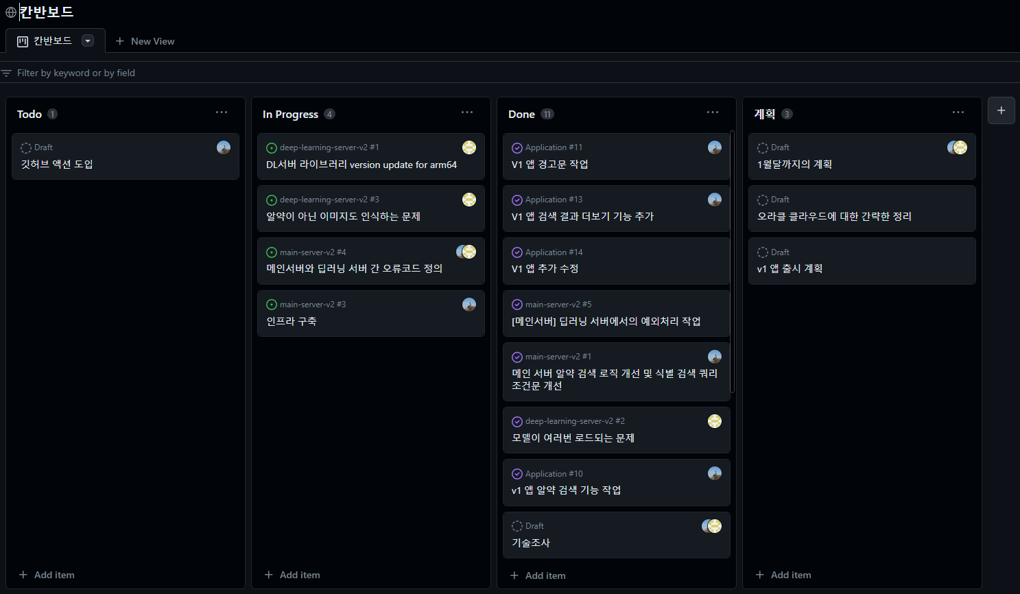 : 본래 칸반보드에서 메인 서버 / 딥러닝 서버 / 인프라의 이슈를 한 눈에 보고자 했지만, 이슈가 난잡하게 섞이는 문제가 있을 뿐더러 오래된 이슈, 중요도가 낮은 이슈가 함께 보이기 때문에 불편함이 있다
