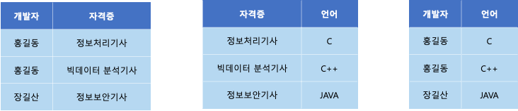 : 위 테이블의 경우 개발자 > 자격증, 개발자 > 언어, 자격증 > 언어가 연관이 있으므로 제 5 정규형에 위배된다