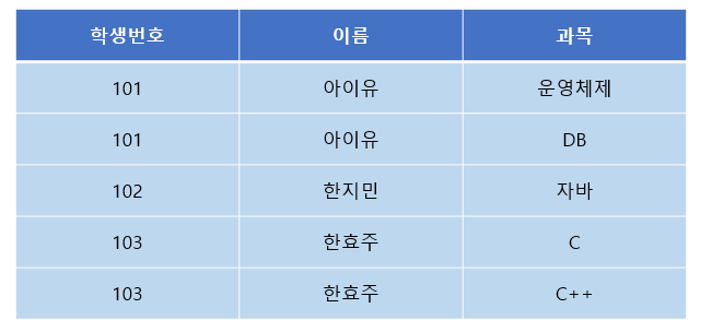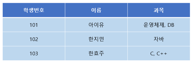 : 학생번호는 단일 값인데 반해 과목과 취미가 다중 값을 가진다