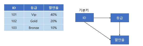 : 등급과 할인율에 대한 속성을 테이블로 분리하여 이행 함수 종속을 제거