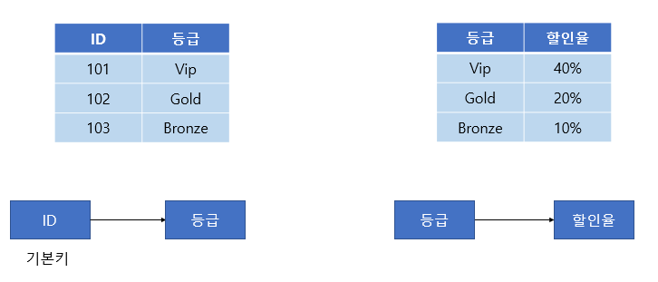 : ID를 통해 등급을 알 수 있는데, 등급을 통해서 할인율을 알 수 있다