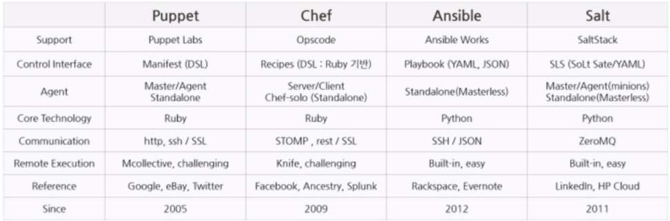 : 오픈소스 기반의 프로비저닝, 구성관리, 애플리케이션 전개 도구 (가장 많이 사용)