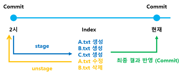 이때 Commit에 저장되는 변경사항은 Stage되어 Commit에 반영된다.