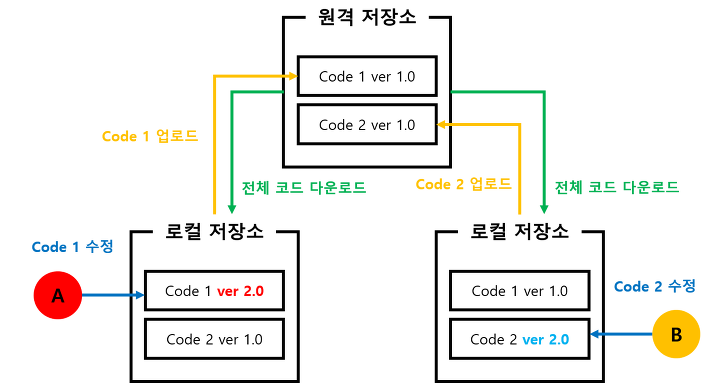 : 원격 저장소의 내용과 로컬 저장소의 내용이 다른 경우 소스파일이 병합되어 로컬 저장소에 반영됨